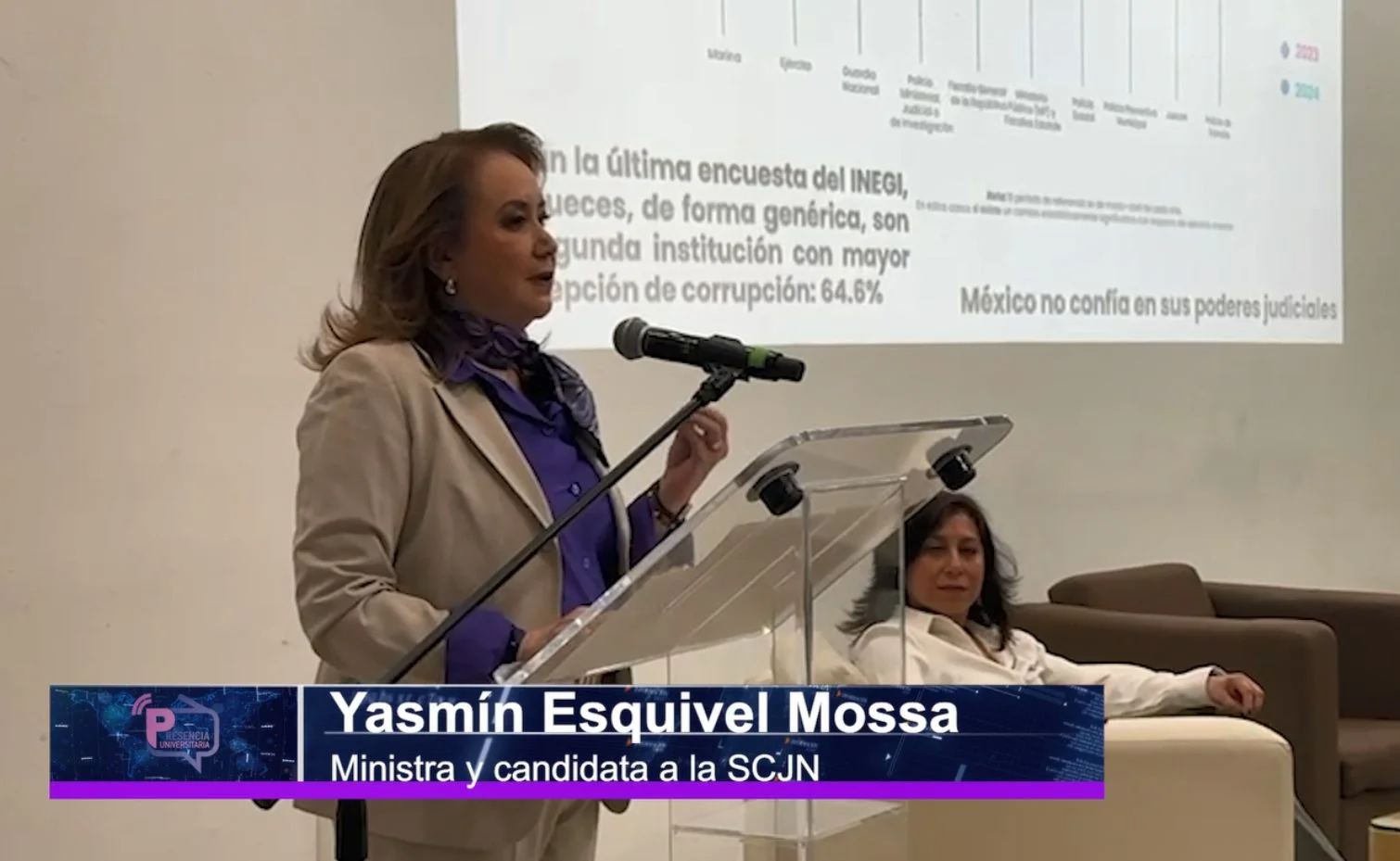 «Los jueces somos los peores evaluados después de la policía de tránsito. Esto es importantísimo porque la percepción de la ciudanía es de corrupción, que no hay un sistema de justicia eficaz, que no hay un sistema de justicia eficiente, que no hay un estado de derecho, que los jueces se tardan en resolver los expedientes, que los jueces se venden», afirmó la candidata a ministra.
