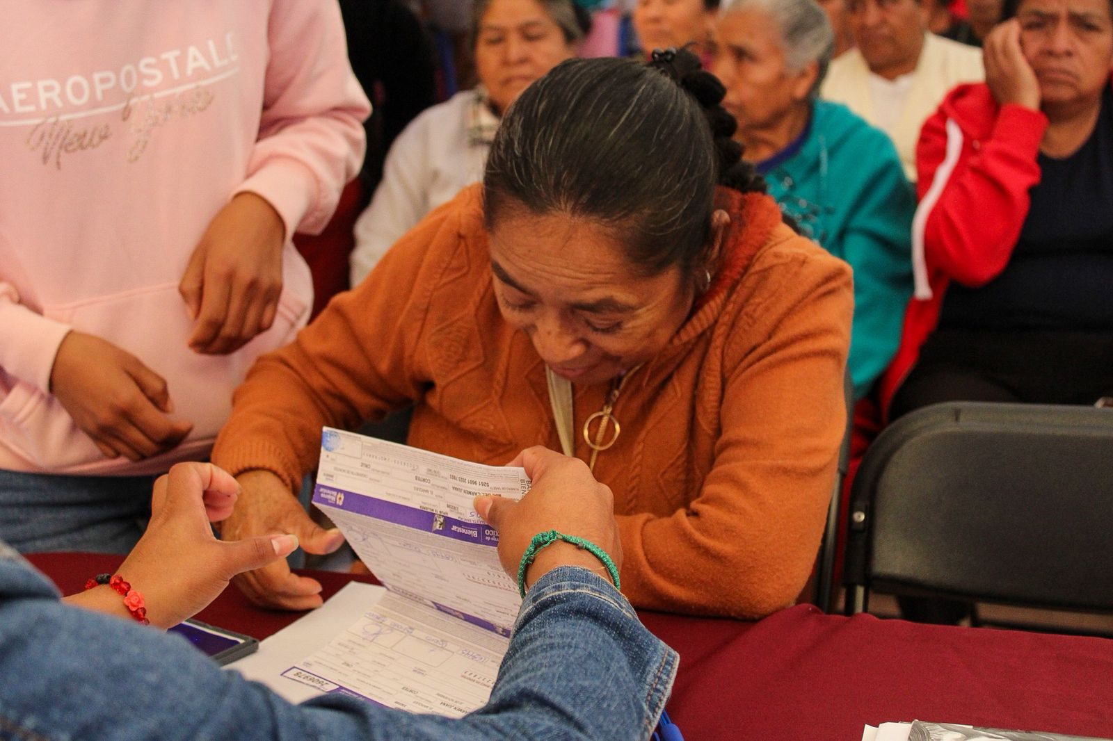 Durante la entrega, las personas beneficiarias reciben una boleta con cuatro vales: dos para despensa, uno para enseres y uno más que sirve como comprobante de que ya se recibió el apoyo.