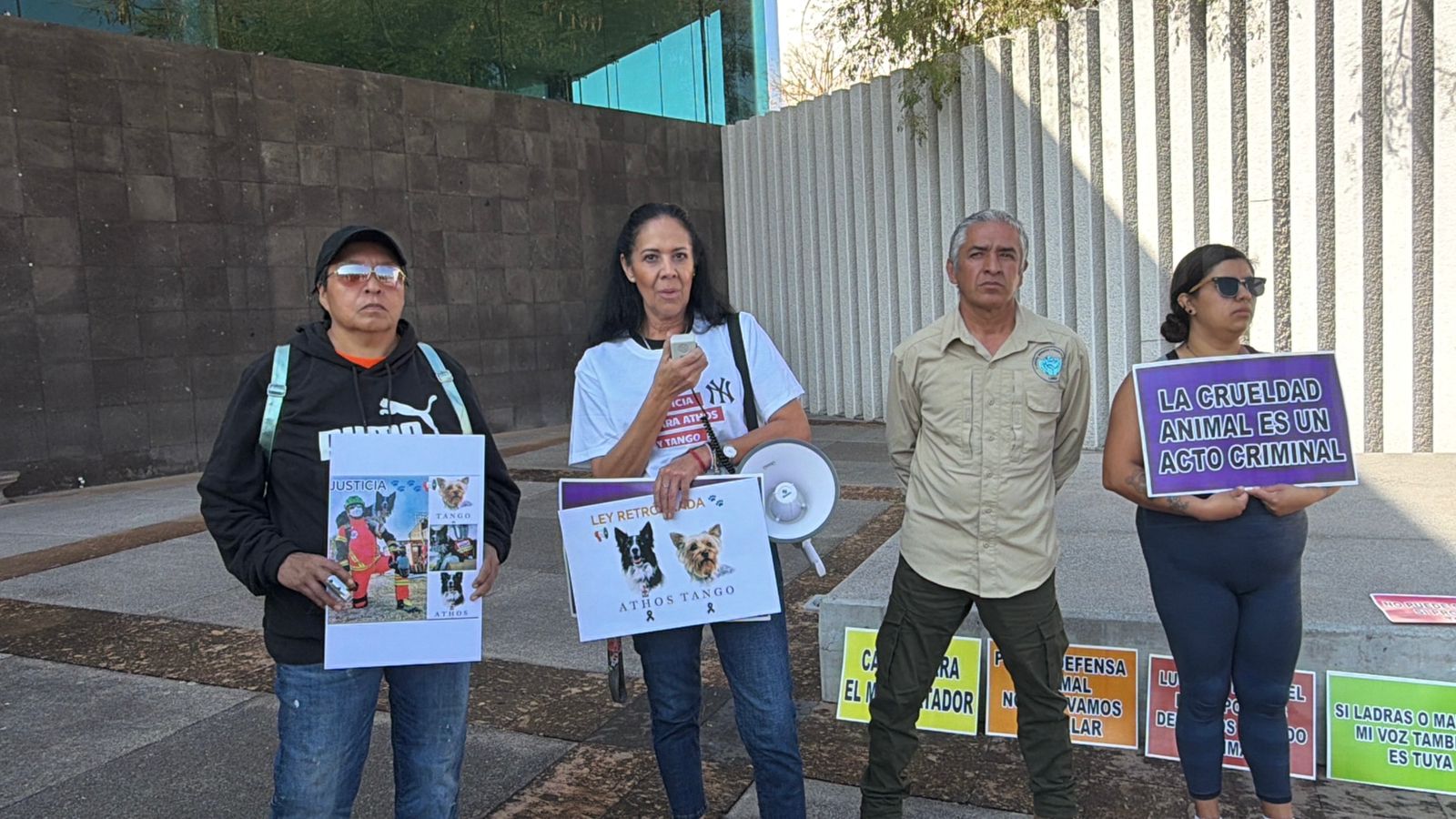 La activista exigió que se respete la ley y la sentencia que ya se había dictado en el juicio. Las pancartas que sostenían los asistentes contaban la historia sin palabras: fotografías de Athos, el border collie rescatista; de Tango, el pequeño yorkshire de asistencia emocional, quienes salvaron múltiples vidas.
