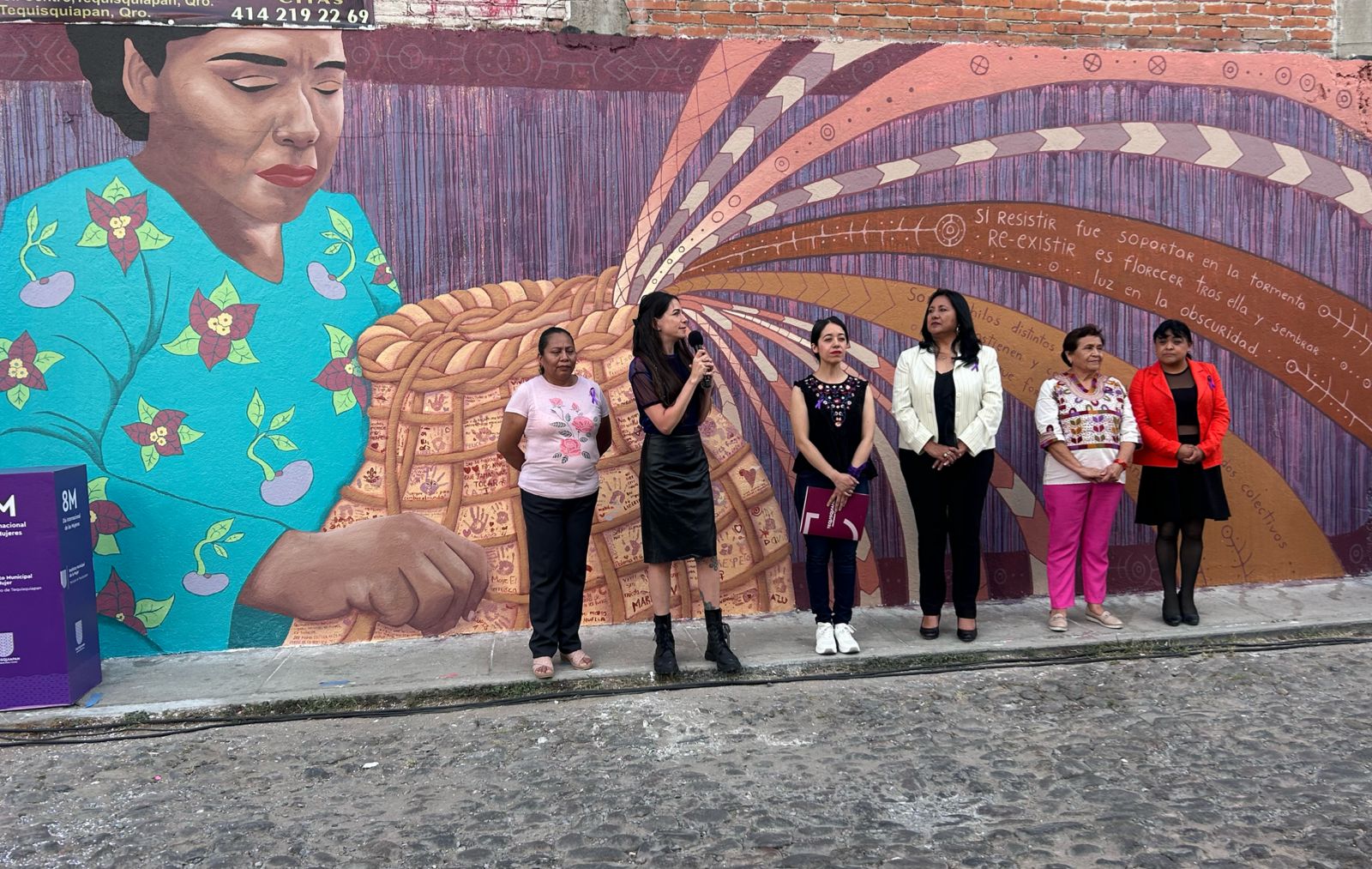 En Tequisquiapan se inauguró el mural comunitario titulado Re-Existencia, una obra que celebra la creatividad, el tejido social y la existencia de las mujeres. La protagonista central del mural es Laura Pérez, una artesana de mimbre del municipio, quien, a través de ella, simbolizan tanto el trabajo artesanal característico de la región como la resiliencia femenina de la zona.