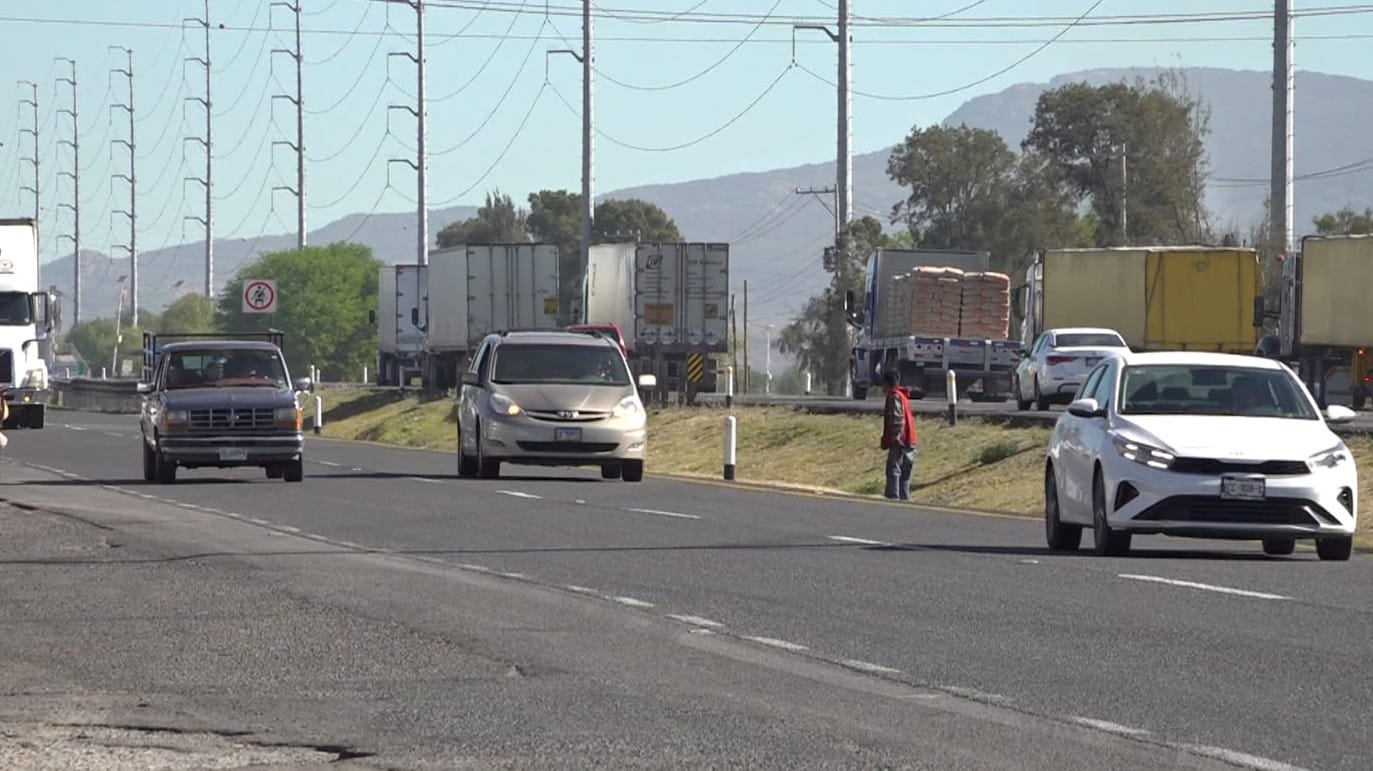 Cada día, trabajadores y estudiantes se desplazan por la carretera Querétaro-San Luis Potosí, a la altura del Parque Industrial Querétaro: Ante la distancia de 3.6 kilómetros entre los pasos peatonales, muchos optan por atravesar la vialidad directamente.
