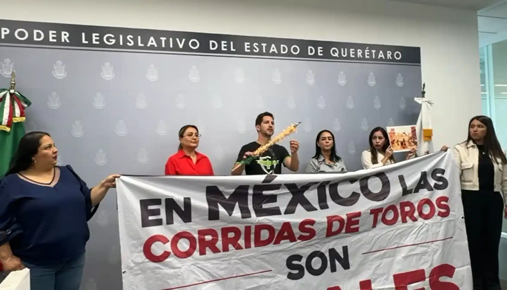«Aplaudimos que por fin tengamos un Congreso Valiente, un congreso progresista, y un congreso que se ponga de lado de la legalidad. Esto es una banderilla real, 6 como esta se le clavan a los toros, es ilegal no se puede torturar a un animal, no se le puede clavar una banderilla durante una corrida de toros, lo dice la Constitución, lo dice la Norma Oficial Mexicana, lo dice las leyes de Protección Animal del Estado de Querétaro», informó Jerónimo Sánchez.