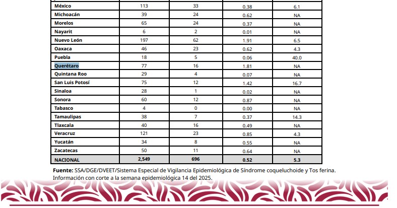 El estado de Querétaro se encuentra entre las cinco entidades del país con las tasas de incidencia más altas por tos ferina en el país, de acuerdo a datos de la Secretaría de Salud del Gobierno de México. De acuerdo al boletín institucional sobre la Semana Epidemiológica 14, que corresponde del 30 de marzo al 5 de abril, Querétaro contaba con 77 casos probables, 16 casos confirmados y ninguna muerte.