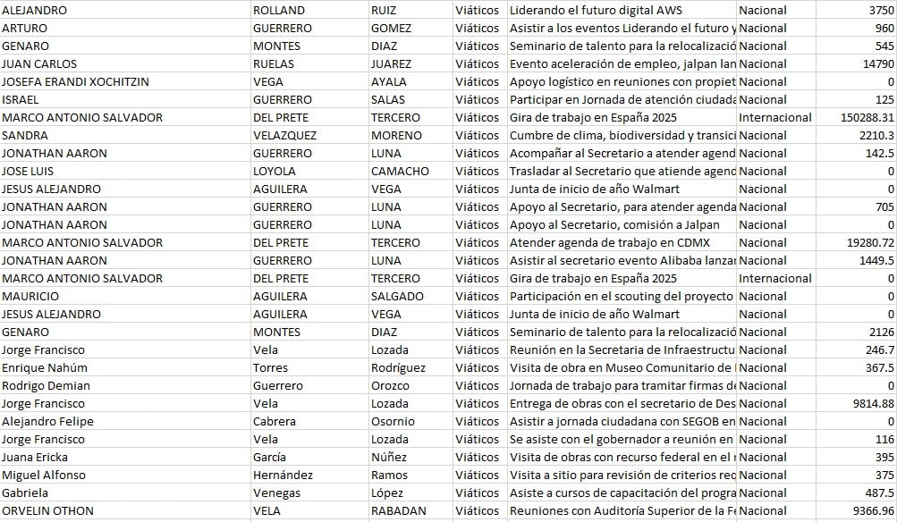 En cuanto a los tipos de viáticos que se aplicaron en el año 2025, se encuentran montos de $77 mil 660 pesos para el traslado vía terrestre respecto a una “Jornada Contigo Gober” realizada en Jalpan de Serra y en la zona del semidesierto, en donde se contemplaron a 10 servidores públicos; entre ellos se encuentra el secretario de gobierno del Estado de Querétaro, Eric Gudiño.